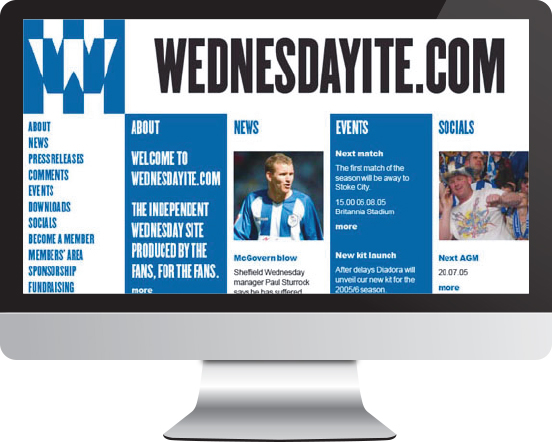 We studied football club identities. Almost all seemed to have been concocted from symbols whose meaning had been long forgotten. Many were even faux crests that had remained unchanged for decades. It would be impossible to garner support for the introduction of a modern version of a Wednesdayite crest and it didn't seem right to design an 'old style' crest that was rooted in sham symbolism — so we set aside crests and concentrated on the only graphic elements that really mattered to the true fans; the blue and white stripes of their beloved team shirts and their name 'Wednesdayite'.
