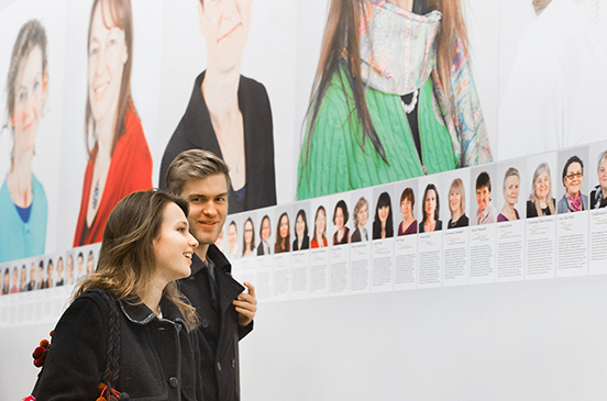 Following Atelier's creation of the King's Strand Campus alumni frieze (see University Alumni), we developed a corridor frieze featuring only senior female professors. They were photographed without special make up, using natural light and simple head and shoulders compositions are accompanied by honest accounts of their career challenges and how they were overcome.